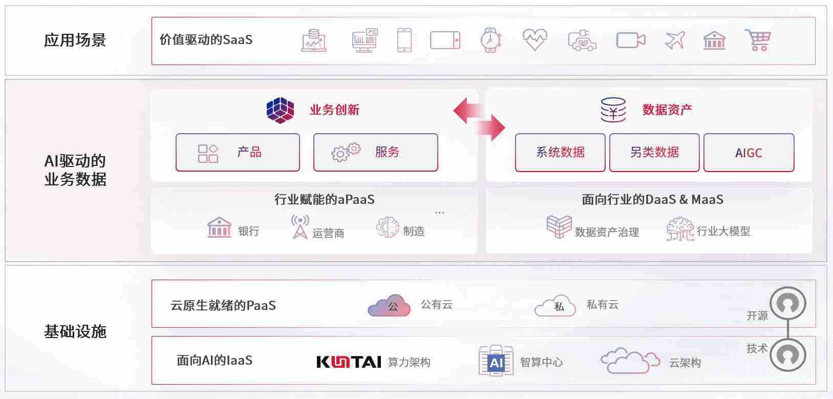 数字时代,,,围绕企业数字化转型的关键要素,,,,PA视讯集团官网数码开创性的提出数云融合战略和技术体系框架,,着力在云原生、、、、数字原生、、、、AI原生和信创产业上架构产品和服务能力,,,为处在不同数字化转型阶段的快消零售、、汽车、、金融、、、医疗、、、政企、、、教育、、、运营商等行业客户提供泛在的敏捷IT能力和融合的数据驱动能力,,,,构建跨界融合创新的数字业务场景和新业务模式,,助力企业级客户建立面向未来的核心能力和竞争优势,,,,全面推动社会的数字化、、智能化转型升级。。